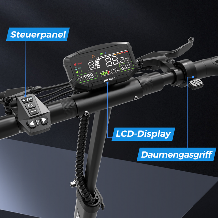 Alles im Griff: Steuern Sie Blinker, Licht und die drei Geschwindigkeitsmodi (10/15/20 km/h) mühelos über das ergonomische Bedienfeld. Perfekt abgestimmt auf den dynamischen Stadtverkehr.