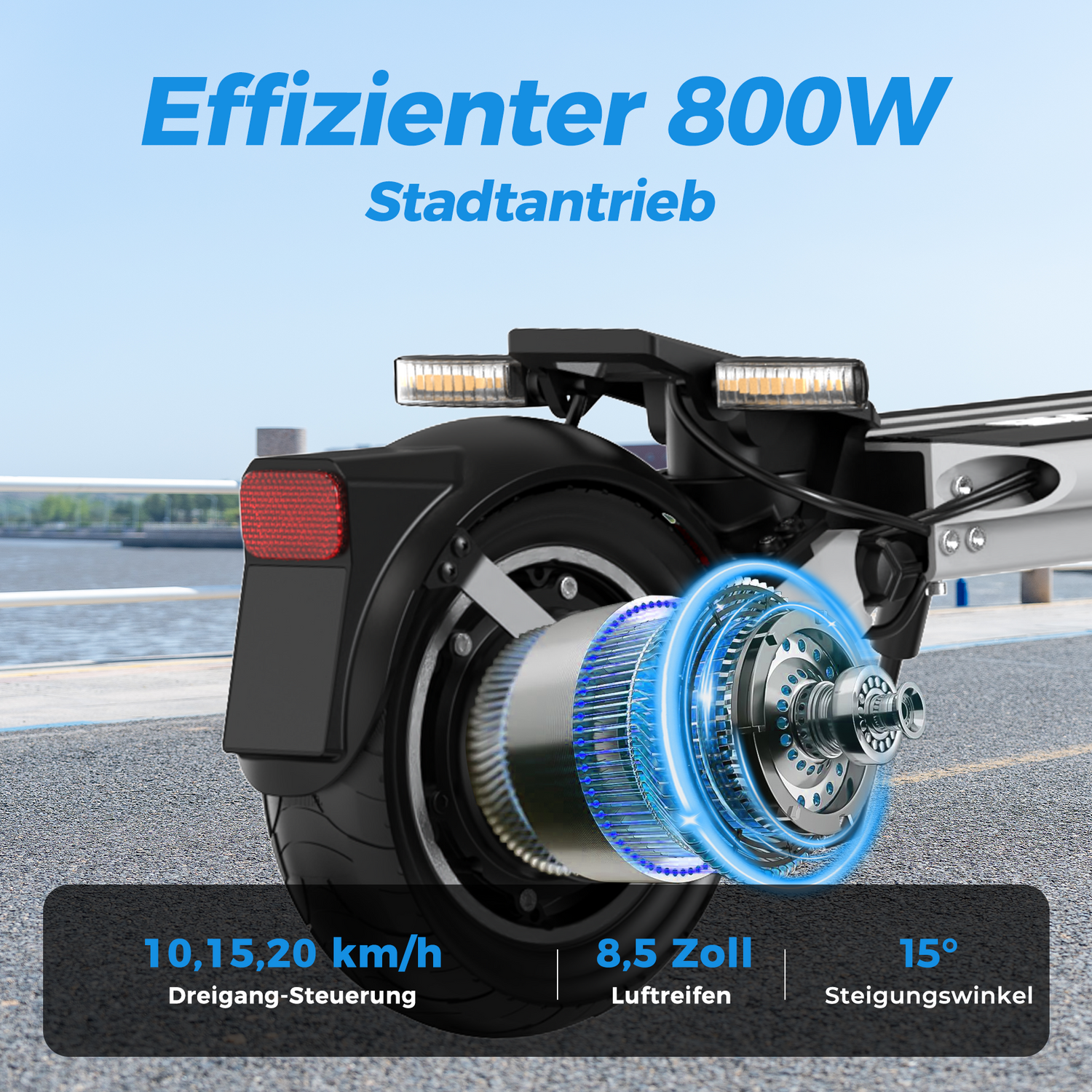 Mit einer Peakleistung von 800W beschleunigen Sie zügig an jeder Ampel. Die 8,5-Zoll-Luftreifen bieten die ideale Mischung aus Wendigkeit und Dämpfung für ein sanftes Gleiten über Asphalt und Pflastersteine.
